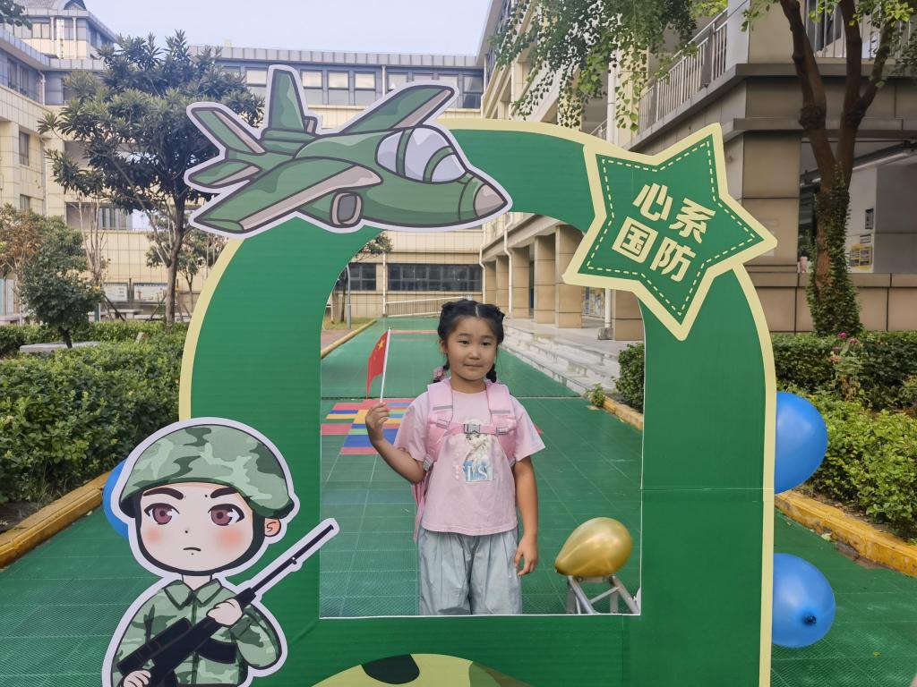 校园主干道两侧,各式飞机、大炮模型整齐陈列,吸引着新生们的目光。孩子们举着红旗在模型旁驻足观察、合影留念,在直观感受国防力量的过程中,悄然播下热爱家国的种子。