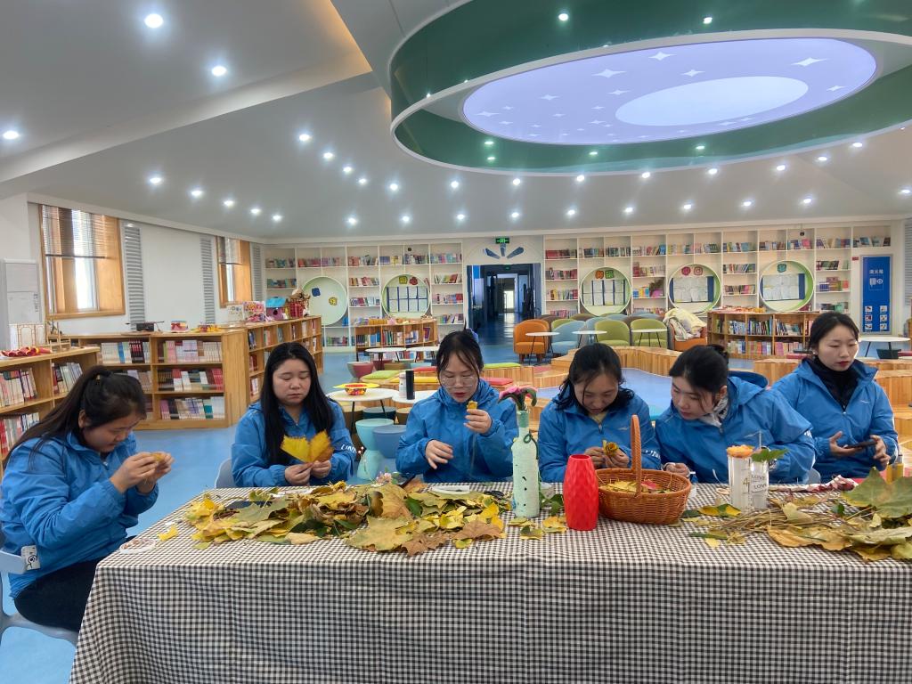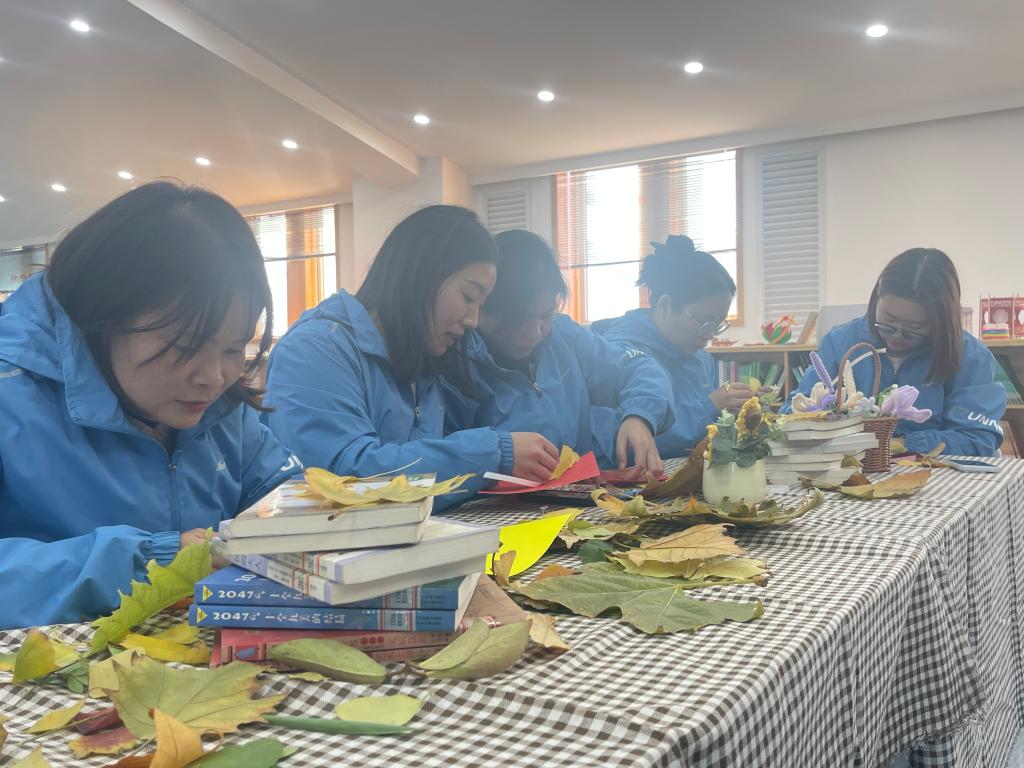 读书交流会在创意手工中落下帷幕,全体低语组教师化身“手工达人”,利用秋日落叶制作花朵盆栽。大家一边交流阅读心得,一边动手裁剪、粘贴,落叶在指尖变成鲜艳的“花朵”,花盆被装点得充满生机。